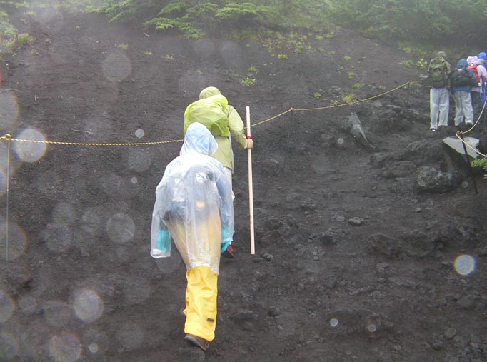 2009年8月1日インドア家族3人で富士山に登りました。言い出しっぺはインドアママです。7月31日PM9時、荷物を車に放り込み一路富士宮登山口五合目に向かいます。駐車場は満車のため300m下った所に路駐、ビールを飲んで車中寝袋就寝。AM4:00起床、軽めの朝食を済ませ小雨の中AM5:45インドア家族いざ出発!